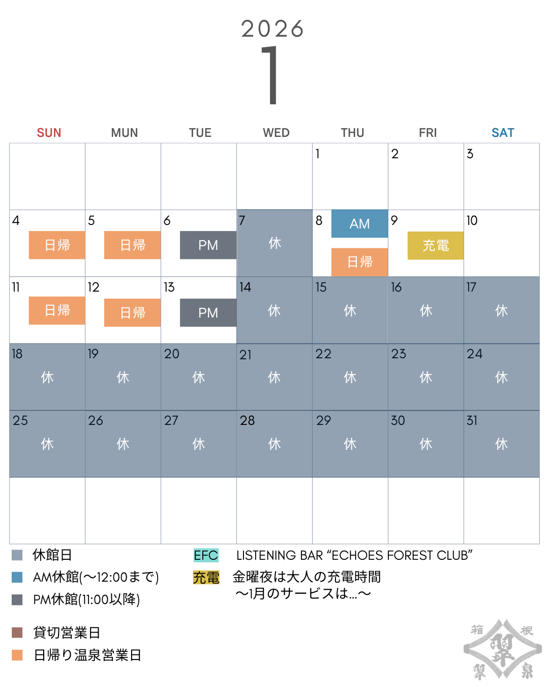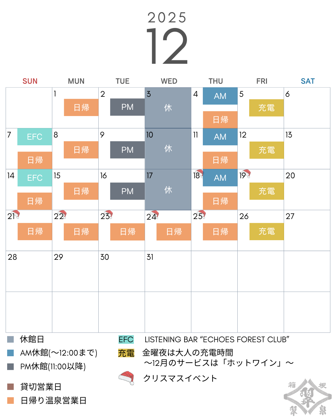 2025年12月・2026年1月の「休館日」及び「日帰り温泉営業日」をご案内申し上げます。