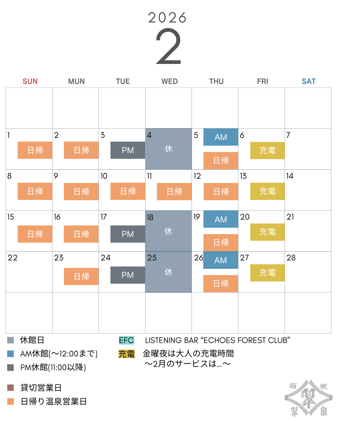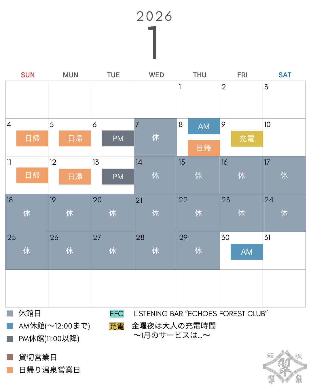 2026年1月・2月の「休館日」及び「日帰り温泉営業日」をご案内申し上げます。