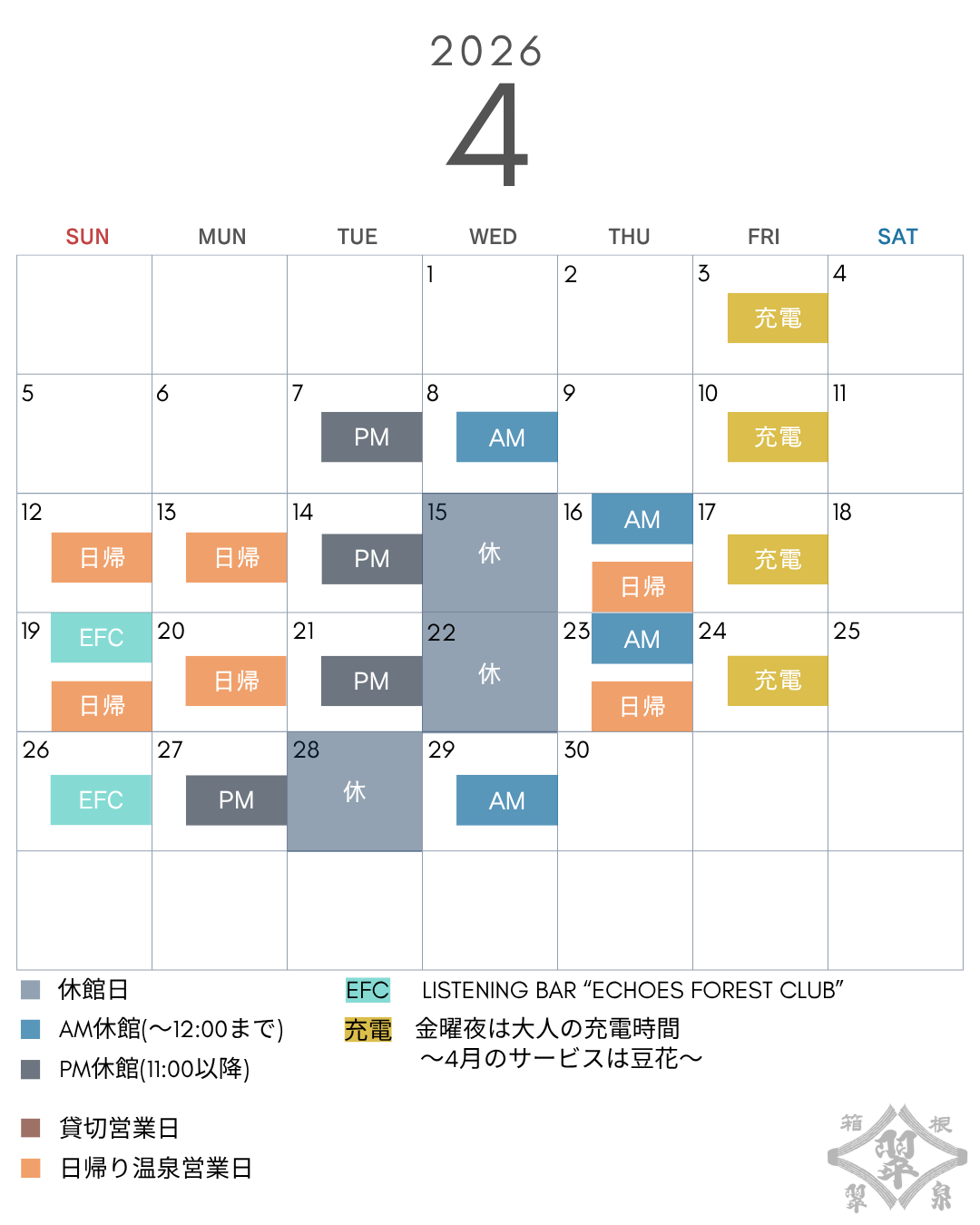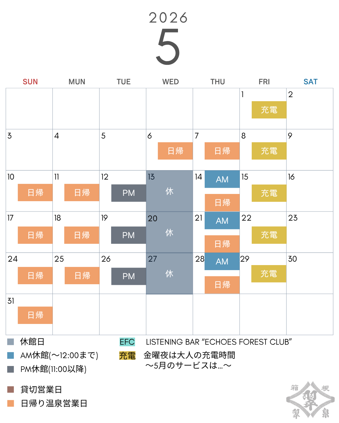 2026年4月・5月の「休館日」及び「日帰り温泉営業日」をご案内申し上げます。